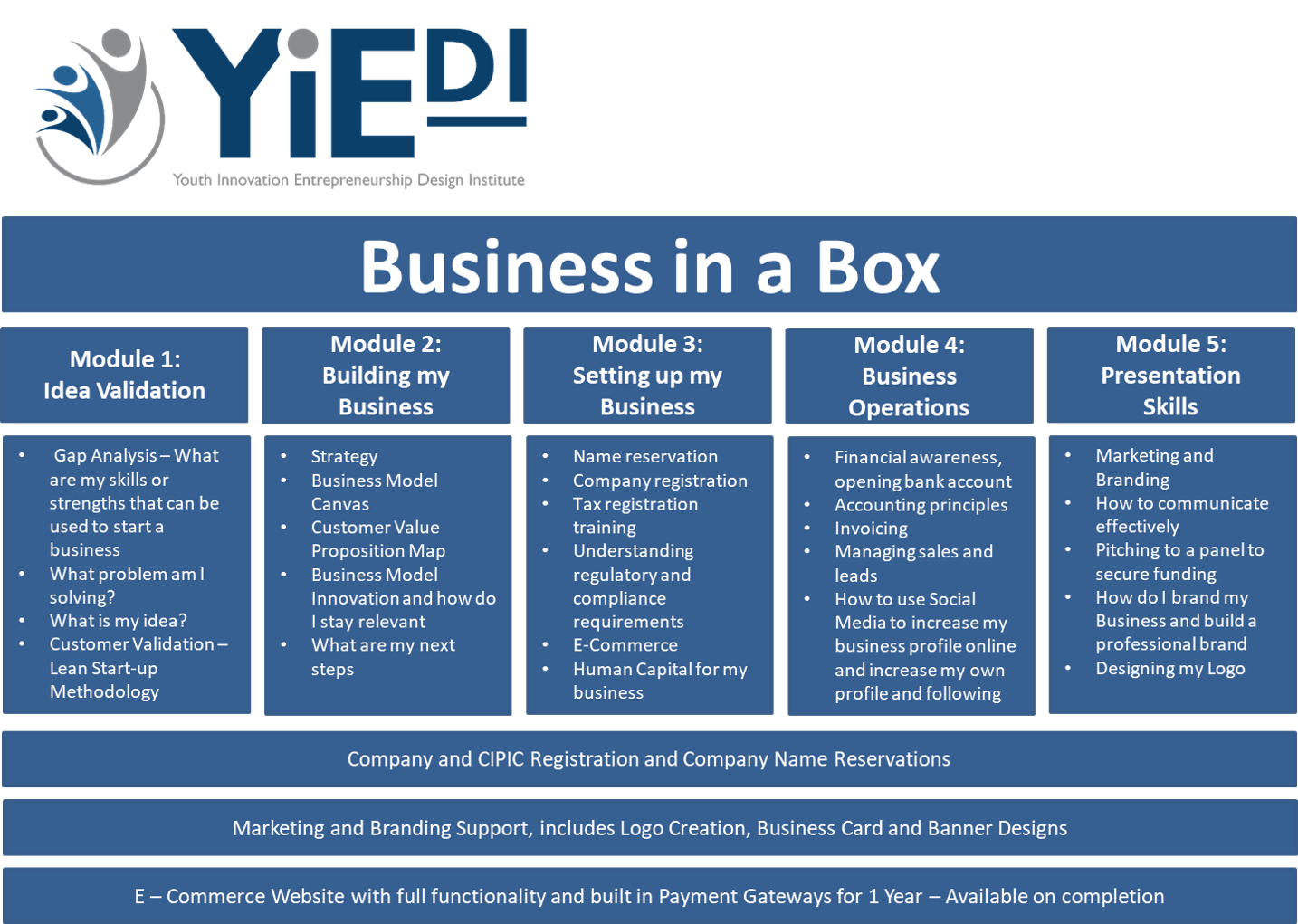 The Business in a Box high touch programme is suited to new entrants into the world of entrepreneurship and provides all of the necessary tools, resources and skills to validate your business idea and kick start your business. In addition to addressing some of the gaps, the delegates get a registered company with CIPIC, marketing and Branding Support, a professional Logo, electronic Business Cards and Banners and access to an E-Commerce platform were they can sell their products and services.